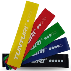 Sada pěti posilovacích gum z přírodního latexu s různou pevností a silou odporu. Žlutá (extra lehká), červená (lehká), zelená (střední), modrá (těžká), černá (extra těžká). V praktickém síťovaném sáčku.